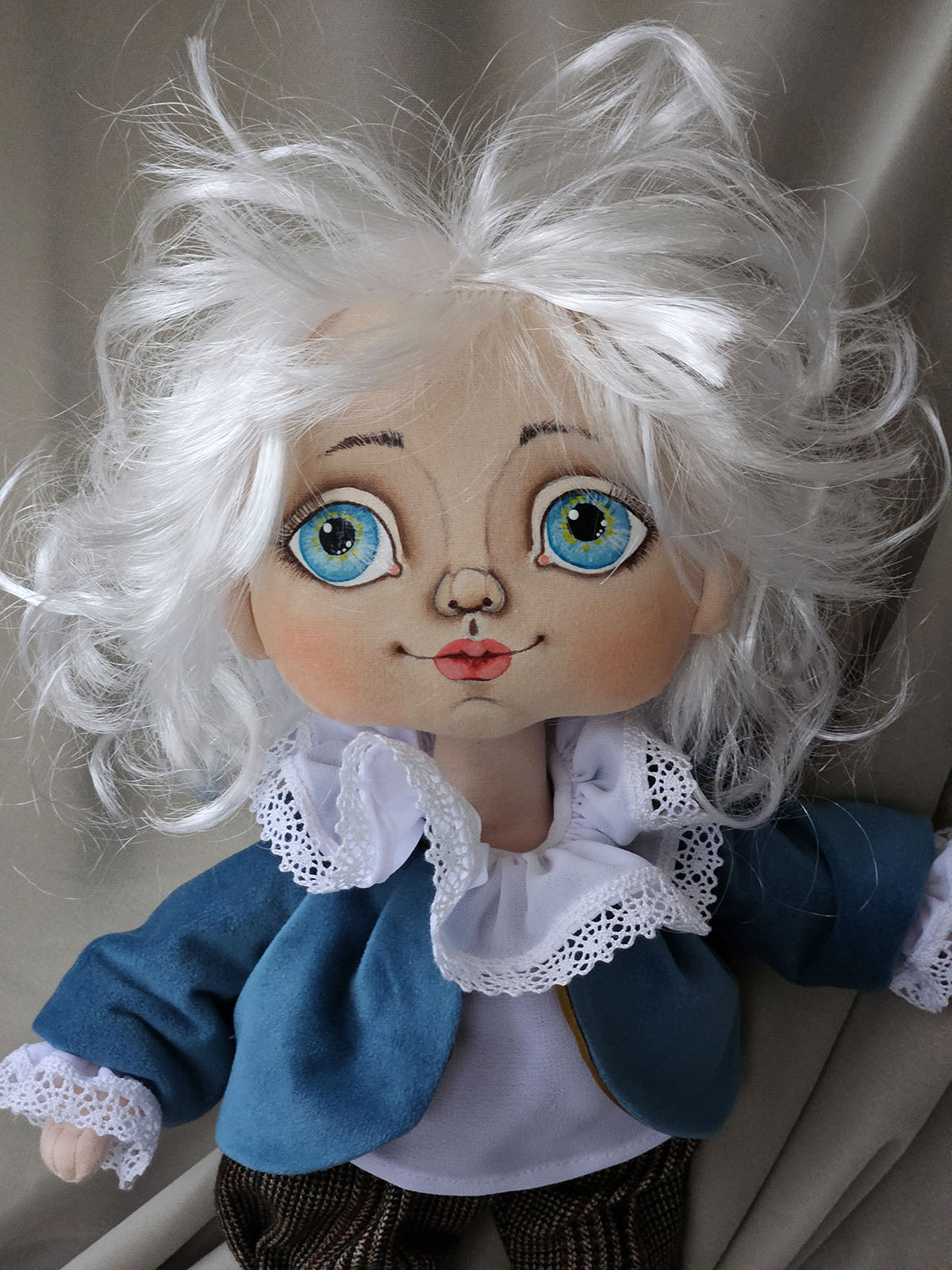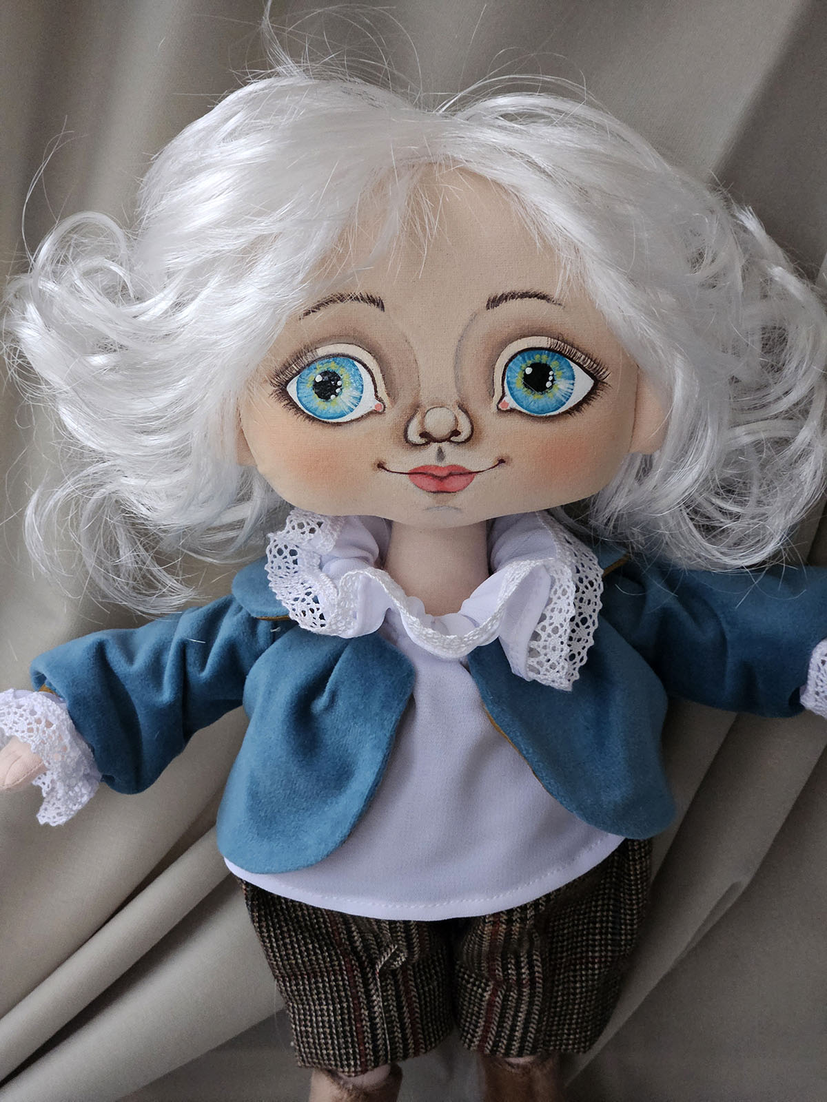 The doll's body is made of calico (100% cotton) and filled with padding polyester and hollowfiber, which does not contain formaldehyde and other harmful reagents. Material certified according to Eco-Tex Standard 100, recommended for use in production for children. Synthetic doll hair glued using hot silicone. The clothes are made from new fabrics - mixed fabric/wool/polyester/viscose/cotton with durable color. The face is painted manually with acrylic paints for fabric and tinted with dry pastel. Eyes covered by transparent varnish; painting is safe when contact with the human body.
