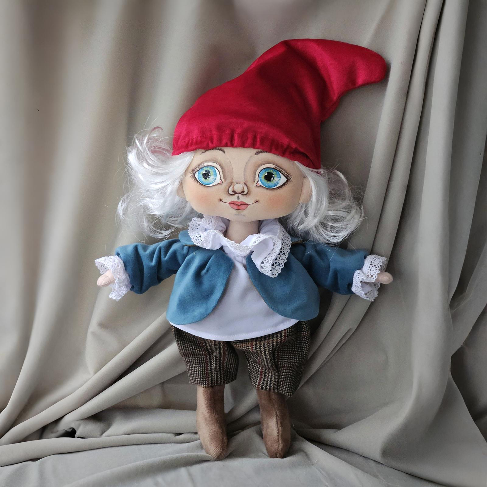 In addition to its decorative function, the Christmas Elf is conceived as a textile toy doll, created with the expectation that children will play with it. Therefore, the Elf and his clothes are sewn as neatly and firmly as possible. Clothes can only be washed by hand in water no higher than 30 degrees and ironed inside out so as not to spoil the quality of the velvet. If necessary, but not very often, the doll itself can only be cleaned by hand with a soft, damp sponge, using mild detergents and without soaking the doll in water. Painting on fabric with acrylic paints is quite resistant to moisture, except for tinting the cheeks with dry pastels. It is not recommended to use strong friction when washing the Elf's face. Dry cleaning is not recommended. It is advisable to hang the doll to dry. Machine washing and drying, as well as drying on heating devices, is not recommended due to the risk of deformation of the toy.